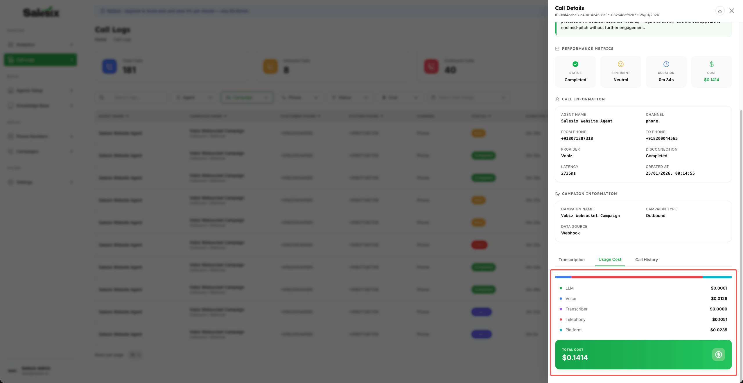 Every call log includes a detailed cost breakdown, allowing you to track ROI and manage your budget with absolute precision.