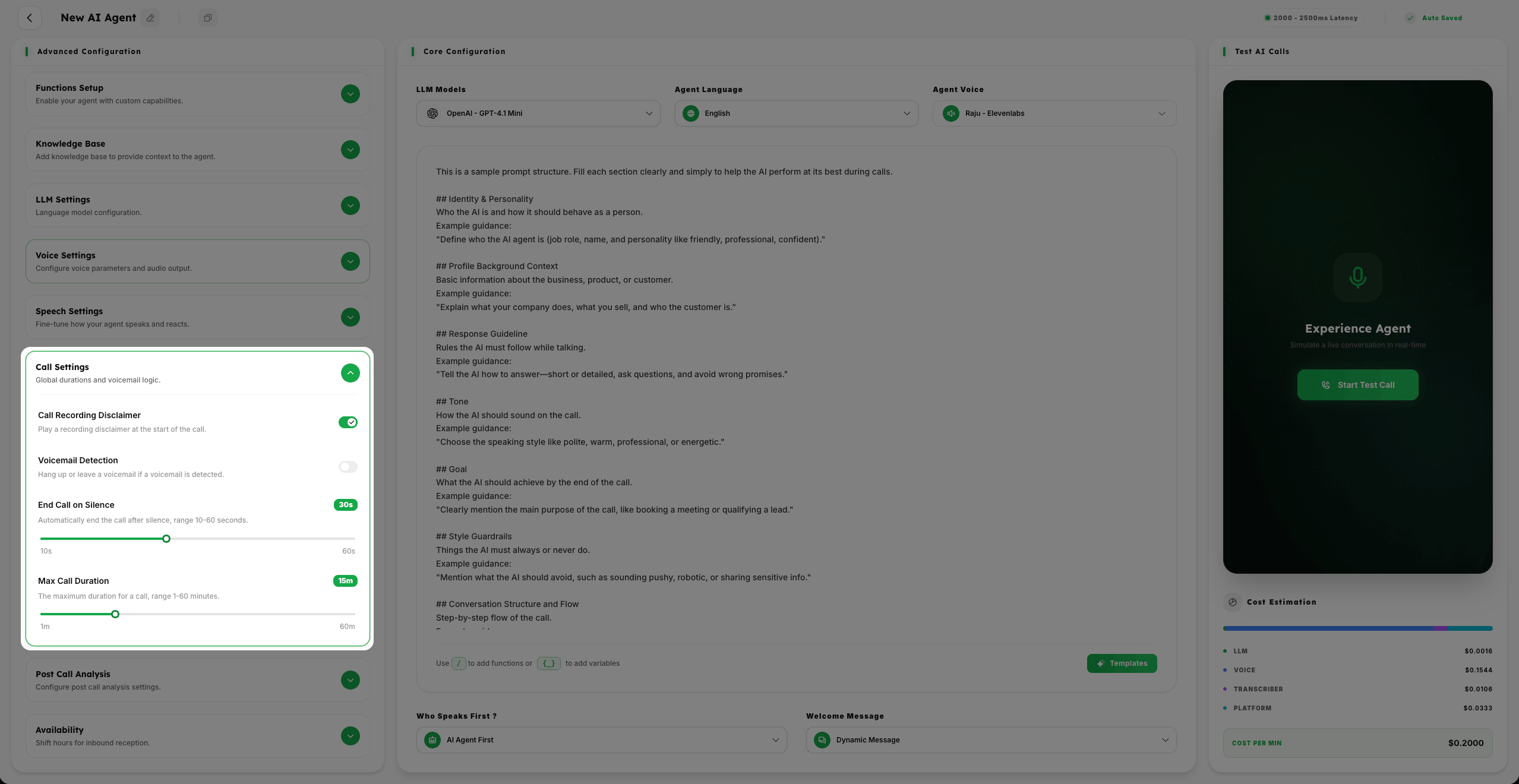 Configure End Call on Silence (10-60 seconds) and Max Call Duration (1-60 minutes) for operational control.