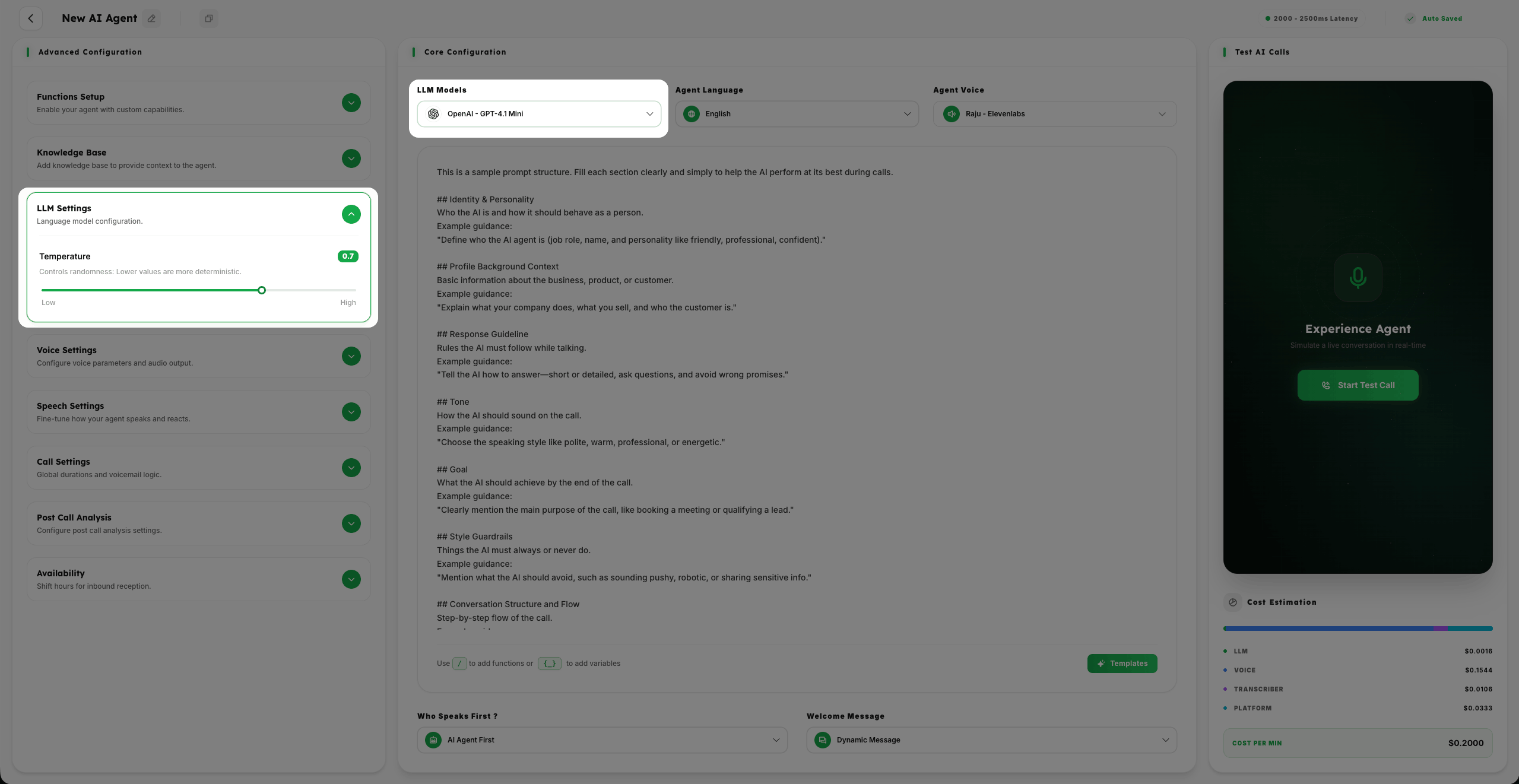 Fine-tune latency, temperature, and specific guardrails to ensure consistent agent performance.