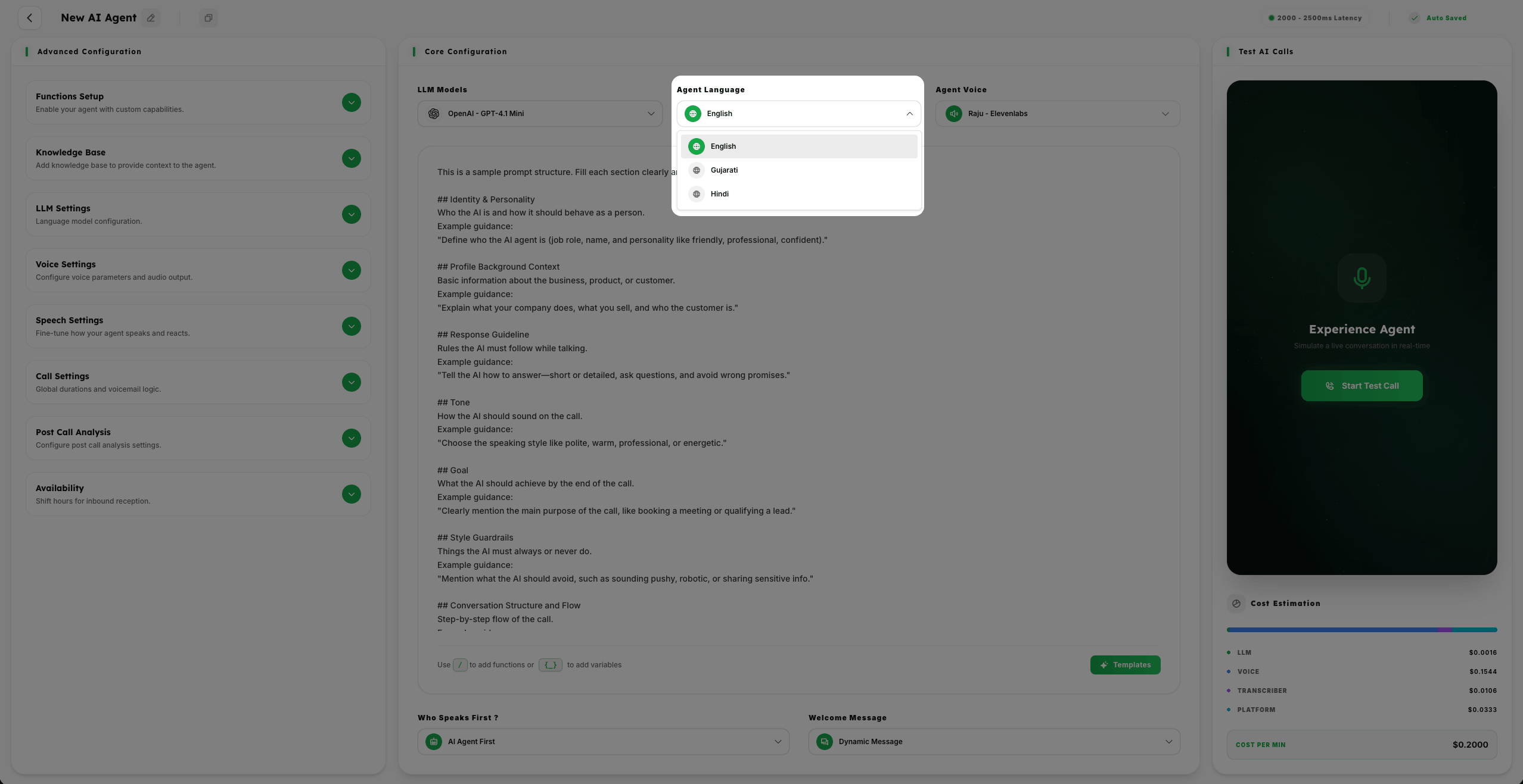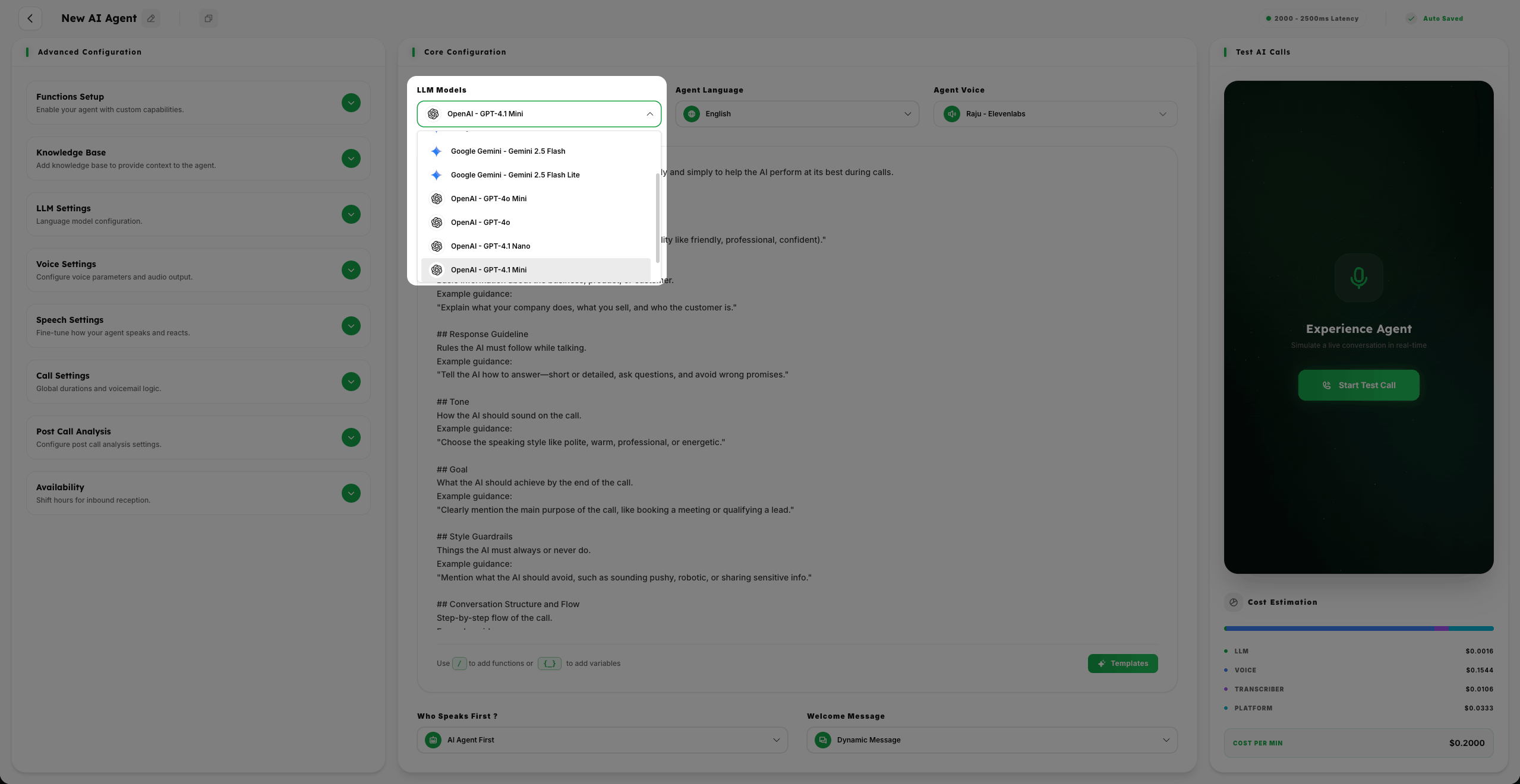 The combination of LLM model, language, and voice selection forms the core identity of your AI agent. Fine-tuning these settings ensures your agent communicates naturally and effectively with your target audience.